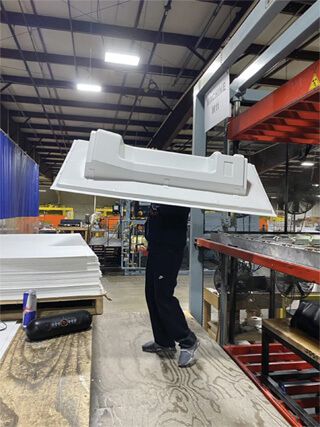 A Duo-Form worker removes the train interior panel from the press for trimming.